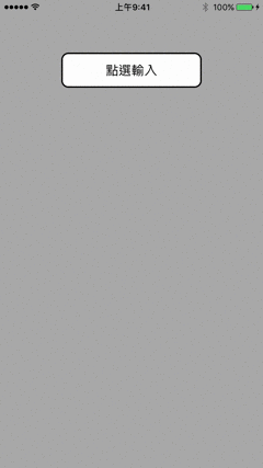 button.frame.size = CGSize(width: 200, height: 50) button.center = CGPoint(x: WIDTH / 2, y: 100) button.backgroundColor = .white button.setTitle("點選輸入", for: .normal) button.setTitleColor(.black, for: .normal) button.layer.cornerRadius = 10 button.layer.borderWidth = 2 button.layer.borderColor = UIColor.black.cgColor button.addTarget(self, action: #selector(buttonpressed), for: .touchDown) view.addSubview(button)UILabel(給予使用者提示)
