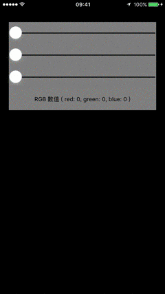 // 長寬 redslider.frame.size = CGSize(width: WIDTH - 40, height: 50) // 中心 redslider.center = CGPoint(x: WIDTH / 2, y: 75) // 背景顏色 redslider.backgroundColor = UIColor(red: 255/255, green: 255/255, blue: 255/255, alpha: 0.5) // 滑動條右邊顏色 redslider.maximumTrackTintColor = .black // 滑動條左邊顏色 redslider.minimumTrackTintColor = .red // 滑桿顏色 redslider.thumbTintColor = .white // 最小 redslider.minimumValue = 0.0 // 最大 redslider.maximumValue = 255.0 // 不放手, 計數 redslider.isContinuous = true // 加入動作 redslider.addTarget(self, action: #selector(slideraction), for: .valueChanged) view.addSubview(redslider) // 重複相同動作, 建立greenslider greenslider.frame.size = CGSize(width: WIDTH - 40, height: 50) greenslider.center = CGPoint(x: WIDTH / 2, y: 125) greenslider.backgroundColor = UIColor(red: 255/255, green: 255/255, blue: 255/255, alpha: 0.5) greenslider.maximumTrackTintColor = .black greenslider.minimumTrackTintColor = .green greenslider.thumbTintColor = .white greenslider.minimumValue = 0 greenslider.maximumValue = 255 greenslider.isContinuous = true greenslider.addTarget(self, action: #selector(slideraction), for: .valueChanged) view.addSubview(greenslider) // 重複相同動作, 建立blueslider blueslider.frame.size = CGSize(width: WIDTH - 40, height: 50) blueslider.center = CGPoint(x: WIDTH / 2, y: 175) blueslider.backgroundColor = UIColor(red: 255/255, green: 255/255, blue: 255/255, alpha: 0.5) blueslider.maximumTrackTintColor = .black blueslider.minimumTrackTintColor = .blue blueslider.thumbTintColor = .white blueslider.minimumValue = 0 blueslider.maximumValue = 255 blueslider.isContinuous = true blueslider.addTarget(self, action: #selector(slideraction), for: .valueChanged) view.addSubview(blueslider)UILabel(顯示數值)